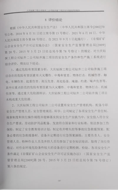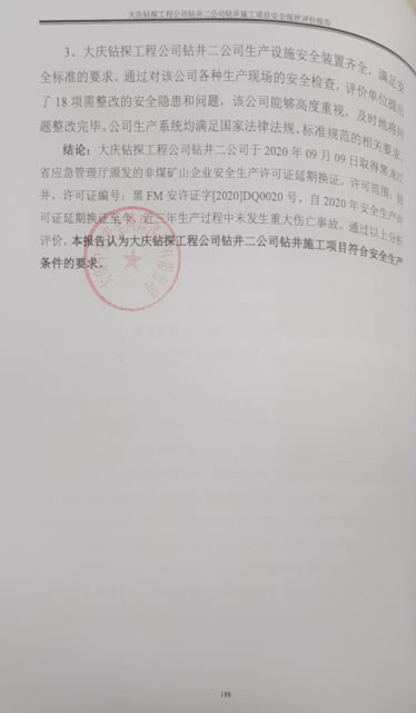 大庆钻探工程公司钻井二公司于2020年09月09日取得黑龙江省应急管理厅颁发的非煤矿山企业安全生产许可证延期换证,许可范围:钻井,许可证编号:黑FM安许证字[2020]DQ0020号。自2020年安全生产许可证延期换证至今,近三年生产过程中未发生重大伤亡事故。通过以上分析评价,本报告认为大庆钻探工程公司钻井二公司钻井施工项目符合安全生产条件的要求。 |