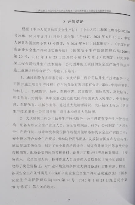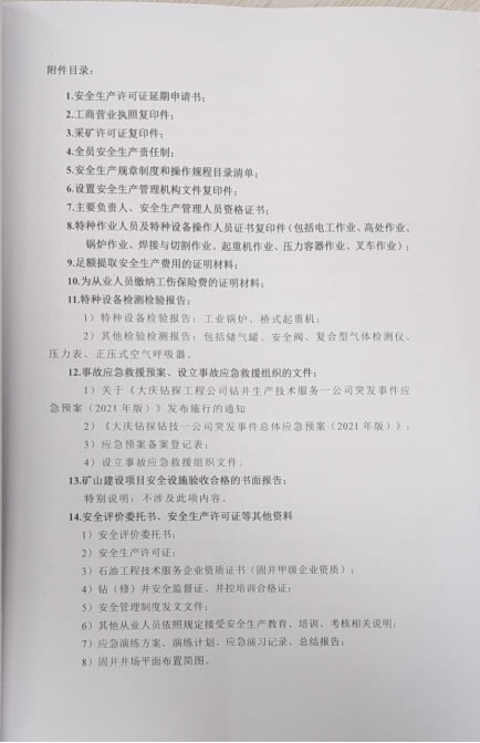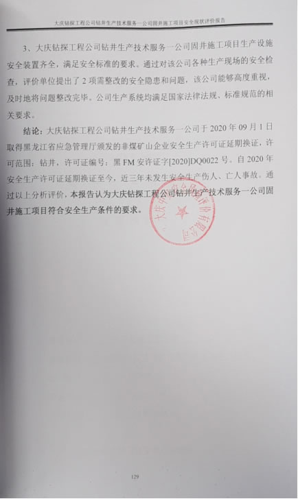 大庆钻探工程公司钻井生产技术服务一公司于2020年09月1日取得黑龙江省应急管理厅颁发的非煤矿山企业安全生产许可证延期换证,许可范围:钻井,许可证编号:黑FM安许证字[2020]DQ0022号。自2020年安全生产许可证延期换证至今,近三年未发生安全生产伤人、亡人事故。通过以上分析评价,本报告认为大庆钻探工程公司钻井生产技术服务一公司固井施工项目符合安全生产条件的要求。 |