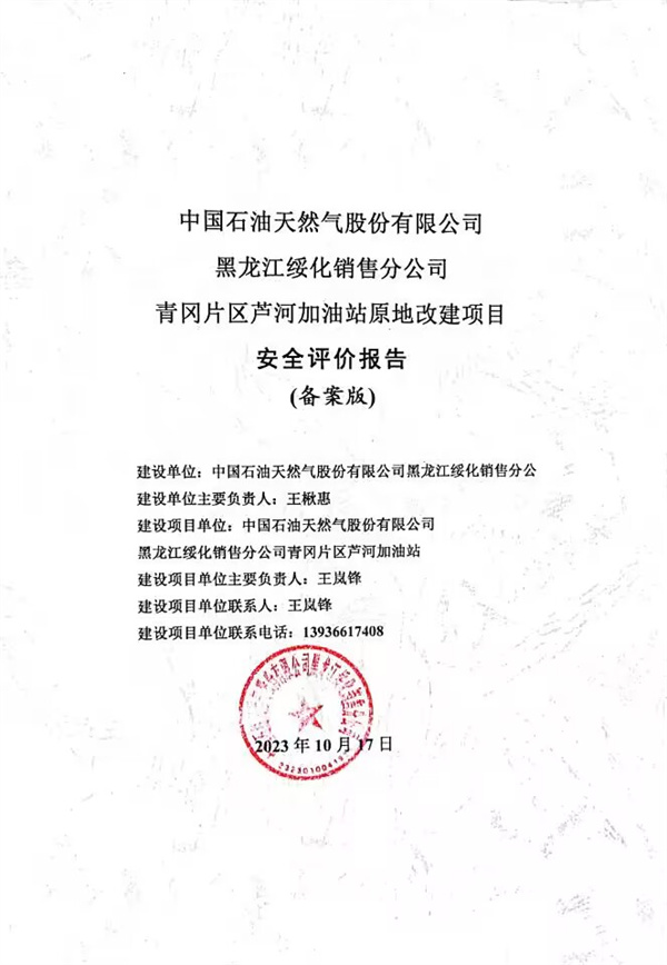 中国石油天然气股份有限公司黑龙江绥化销售分公司青冈片区芦河加油站原地改建项目安全预评价