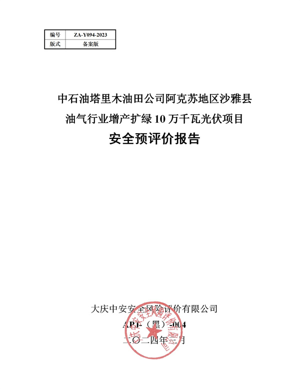 中石油塔里木油田公司阿克苏地区沙雅县油气行业增产扩绿10万千瓦光伏项目安全预评价报告 |