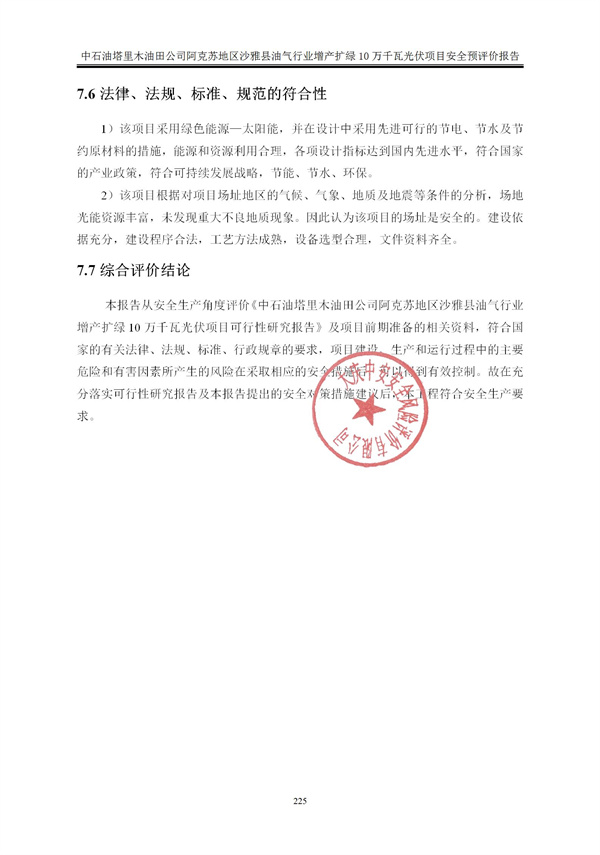 本报告从安全生产角度评价《中石油塔里木油田公司阿克苏地区沙雅县油气行业增产扩绿10万千瓦光伏项目可行性研究报告》及项目前期准备的相关资料,符合国家的有关法律、法规、标准、行政规章的要求,项目建设、生产和运行过程中的主要危险和有害因素所产生的风险在采取相应的安全措施后,可以得到有效控制。故在充分落实可行性研究报告及本报告提出的安全对策措施建议后,本工程符合安全生产要求。 |
