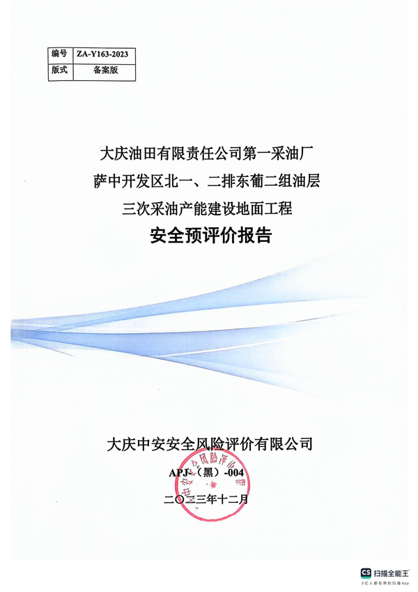 大庆油田有限责任公司第一采油厂萨中开发区北一、二排东葡二组油层三次采油产能建设地面工程安全预评价报告 |