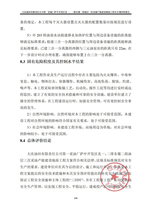 大庆油田有限责任公司第一采油厂萨中开发区北一、二排东葡二组油层三次采油产能建设地面工程方案符合相关法律、法规及标准规范对安全生产的要求。建设单位应在其今后的设计、施工和运行中进一步落实本工程方案提出的安全技术措施和本次安全预评价提出的补充安全措施,确实保证工程安全设施和主体工程的“三同时”,并在工程竣工投产后切实加强安全生产管理,以实现工程安全、平稳运行,建成投产后可以确保安全生产。 |