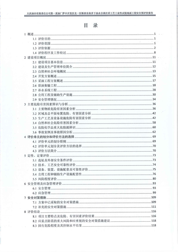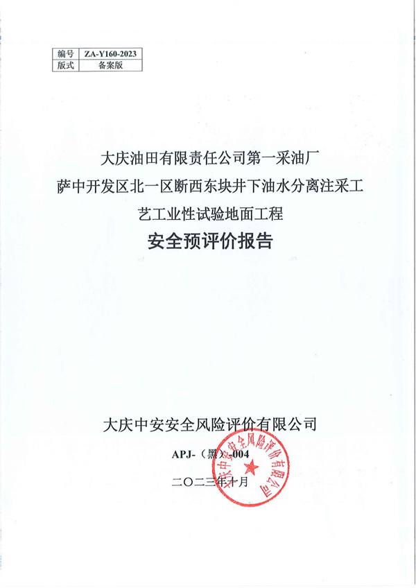 大庆油田有限责任公司第一采油厂萨中开发区北一区断西东块井下油水分离注采工艺工业性试验地面工程安全预评价报告 |