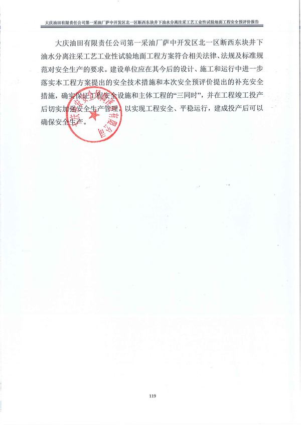 大庆油田有限责任公司第一采油厂萨中开发区北一区断西东块井下油水分离注采工艺工业性试验地面工程方案符合相关法律、法规及标准规范对安全生产的要求。建设单位应在其今后的设计、施工和运行中进一步落实本工程方案提出的安全技术措施和本次安全预评价提出的补充安全措施,确实保证工程安全设施和主体工程的“三同时”,并在工程竣工投产后切实加强安全生产管理,以实现工程安全、平稳运行,建成投产后可以确保安全生产。 |