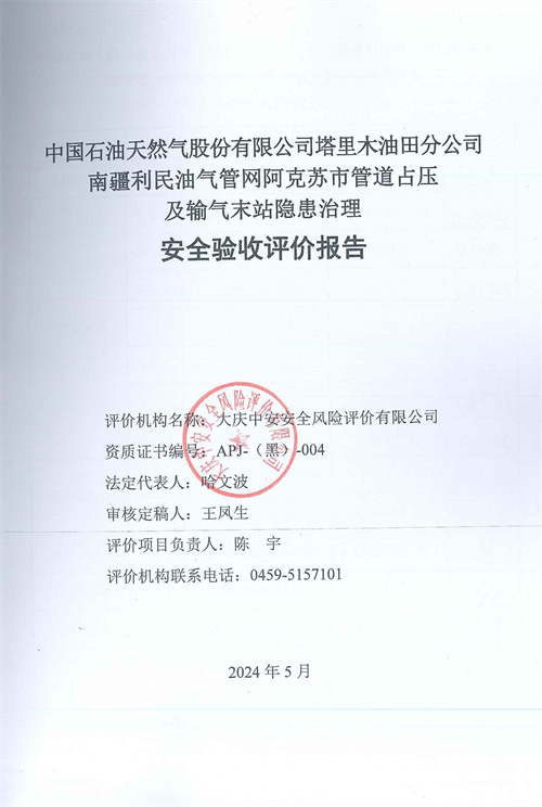 中国石油天然气股份有限公司塔里木油田分公司南疆利民油气管网阿克苏市管道占压及输气末站隐患治理安全验收评价报告 |