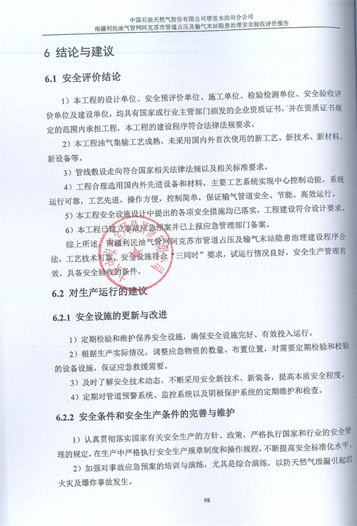 南疆利民油气管网阿克苏市管道占压及输气末站隐患治理建设程序合法,工艺技术可靠,安全设施符合“三同时”要求,试运行情况良好,安全生产管理有效,具备安全验收的条件。 |