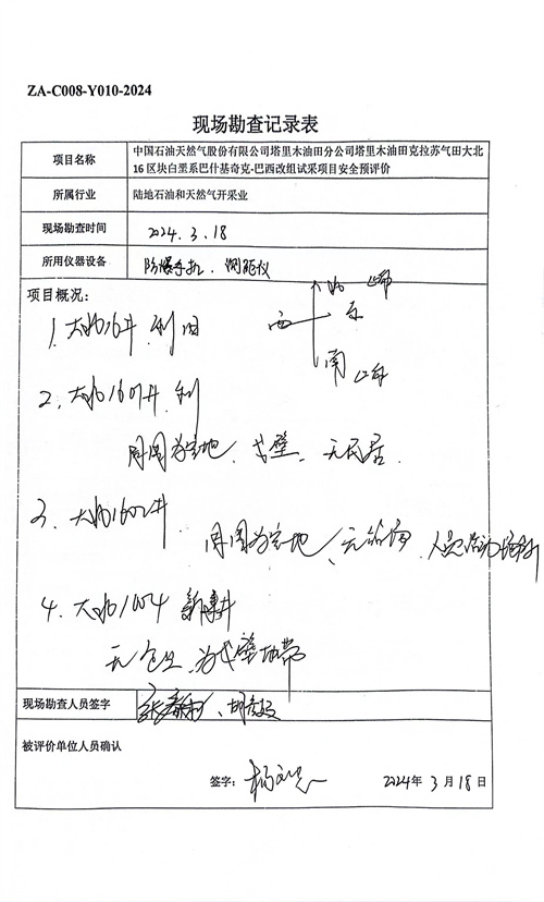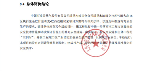 中国石油天然气股份有限公司塔里木油田分公司塔里木油田克拉苏气田大北16区块白垩系巴什基奇克-巴西改组试采项目方案符合相关法律、法规及标准规范对安全生产的要求。建设单位应在其今后的设计、施工和运行中进一步落实本工程方案提出的安全技术措施和本次预评价提出的补充安全措施,确实保证工程安全设施和主体工程的“三同时”,并在工程竣工投产后切实加强安全生产管理,以实现工程安全、平稳运行,本项目危险有害因素能够得到控制,建成投产后,能达到有关法律、法规及标准规定的安全要求。 |