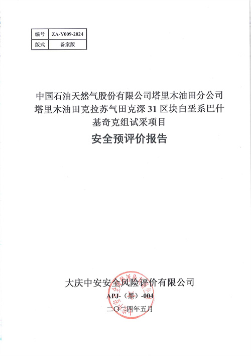 中国石油天然气股份有限公司塔里木油田克拉苏气田克深31区块白垩系巴什基奇克组试采项目安全预评价 |