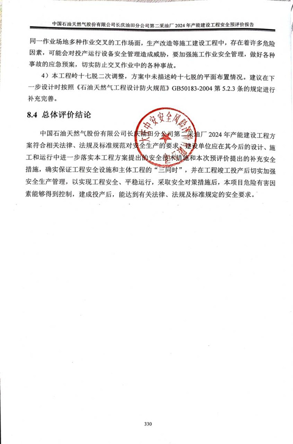 中国石油天然气股份有限公司长庆油田分公司第二采油厂2024年产能建设工程方案符合相关法律、法规及标准规范对安全生产的要求。建设单位应在其今后的设计、施工和运行中进一步落实本工程方案提出的安全技术措施和本次预评价提出的补充安全措施,确实保证工程安全设施和主体工程的“三同时”,并在工程竣工投产后切实加强安全生产管理,以实现工程安全、平稳运行,采取安全对策措施后,本项目危险有害因素能够得到控制,建成投产后,能达到有关法律、法规及标准规定的安全要求。 |