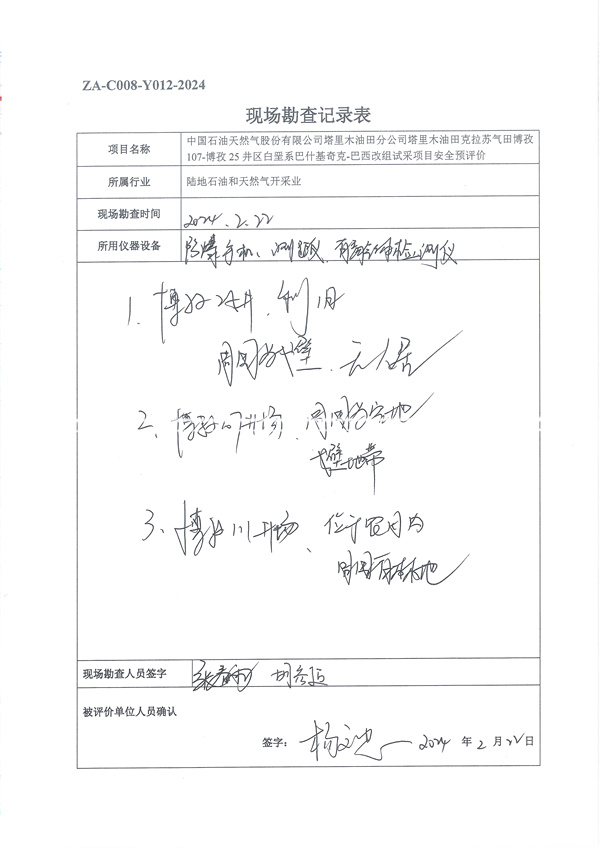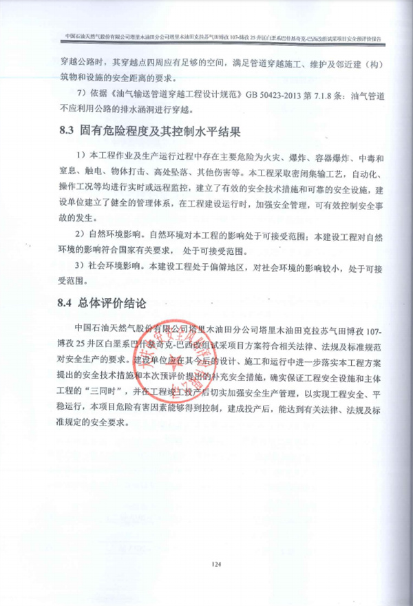 中国石油天然气股份有限公司塔里木油田分公司塔里木油田克拉苏气田博孜107-博孜25井区白垩系巴什基奇克-巴西改组试采项目方案符合相关法律、法规及标准规范对安全生产的要求。建设单位应在其今后的设计、施工和运行中进一步落实本工程方案提出的安全技术措施和本次预评价提出的补充安全措施,确实保证工程安全设施和主体工程的“三同时”,并在工程竣工投产后切实加强安全生产管理,以实现工程安全、平稳运行,本项目危险有害因素能够得到控制,建成投产后,能达到有关法律、法规及标准规定的安全要求。 |