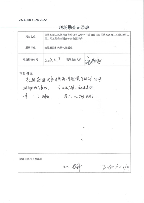 吉林油田二氧化碳开发公司大情字井油田黑125区块CO2驱工业化应用工程二期工程 安全预评价报告