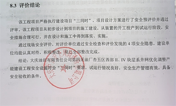 结论:大庆油田有限责任公司第四采油厂杏五区西部II、IV块层系井网优化调整产能建设工程安全设施符合“三同时”要求,试运行情况良好,安全生产管理有效,具备安全验收的条件。 |