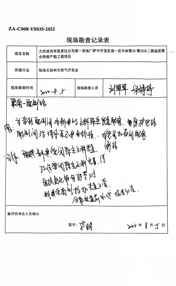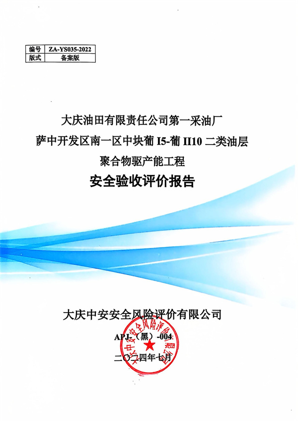 大庆油田有限责任公司第一采油厂萨中开发区南一区中块葡I5-葡II10二类油层聚合物驱产能工程安全验收评价 |