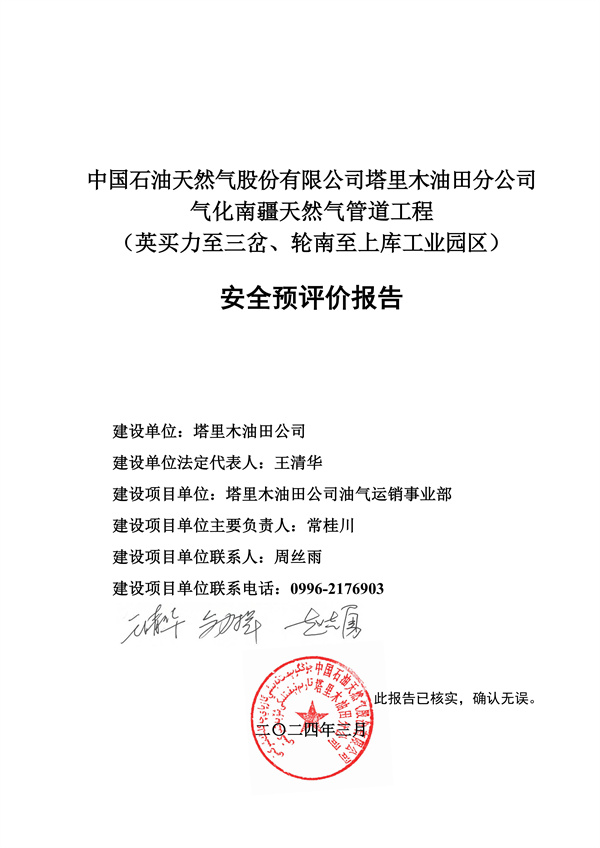 中国石油天然气股份有限公司塔里木油田分公司气化南疆天然气管道工程(英买力至三岔、轮南至上库工业园区)安全预评价