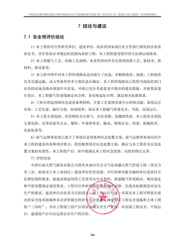中国石油天然气股份有限公司塔里木油田分公司气化南疆天然气管道工程(英买力至三岔、轮南至上库工业园区)建设单位经营范围、可行性研究报告编制单位资质符合法律法规的要求。新建站场选用的工艺技术安全可靠性,新建输气管道路由、阀室选址和平面布置满足规范要求。工程可行性研究报告符合相关法律、法规及标准规范对安全生产的要求。建设单位应在其今后的设计、施工和运行中进一步落实本工程可研报告提出的安全技术措施和本次评价提出的补充安全措施,确实保证工程安全设施和主体工程的“三同时”,并在工程竣工投产后切实加强安全生产管理,以实现工程安全、平稳运行,建成投产后可以达到安全生产的目的。 |