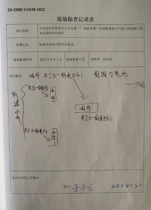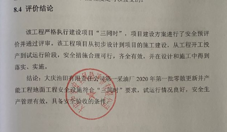 结论:大庆油田有限责任公司第一采油厂2020年第一批零散更新井产能工程地面工程安全设施符合“三同时”要求,试运行情况良好,安全生产管理有效,具备安全验收的条件。 |
