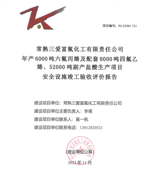 常熟三爱富氟化工有限责任公司年产6000吨六氟丙烯及配套8000吨四氟乙烯、52000吨副产盐酸生产项目安全设施竣工验收评价报告