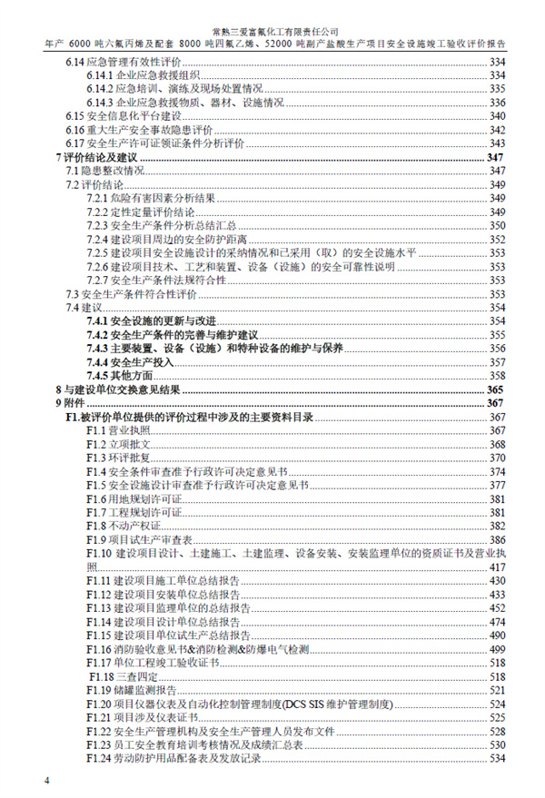 常熟三爱富氟化工有限责任公司年产6000吨六氟丙烯及配套8000吨四氟乙烯、52000吨副产盐酸生产项目安全设施竣工验收评价报告 |